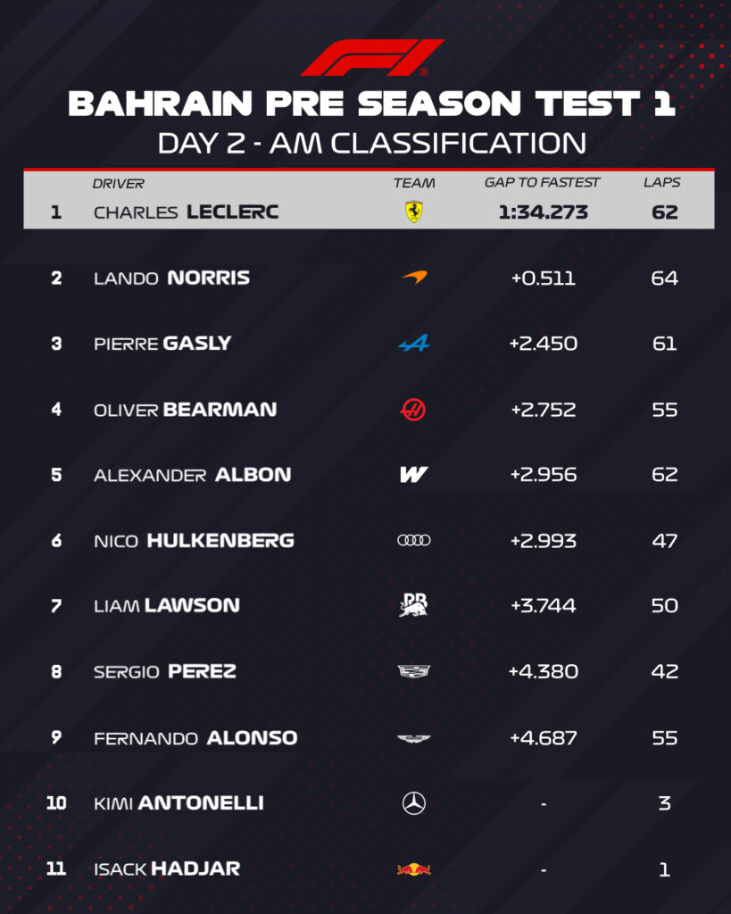 Day 2 of test 1 at 2026 Bahrain F1 testing is in the books, view the full report and results below.