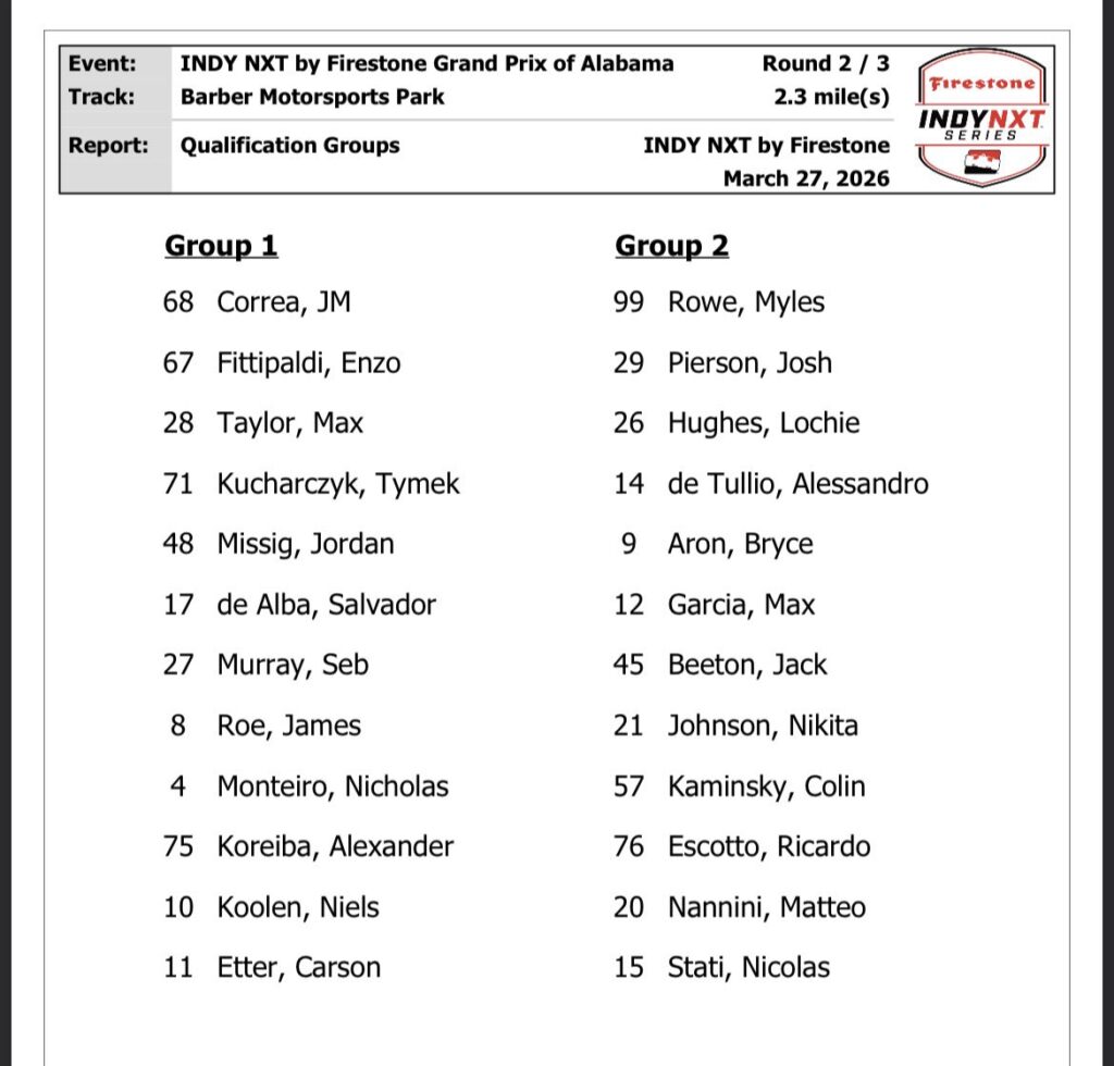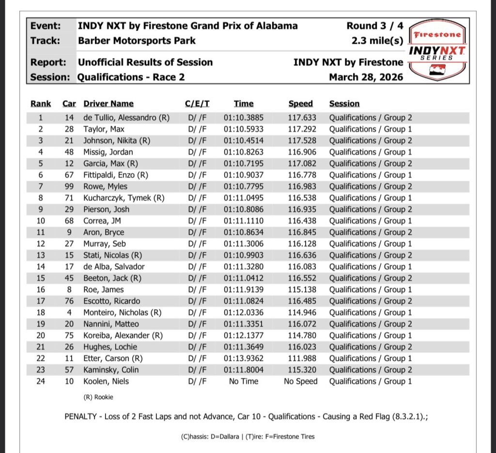 2026 Indy NXT Barber | Qualifying results for round 4