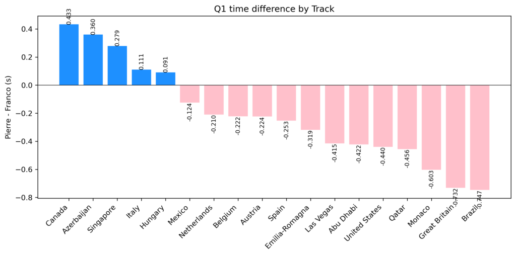Looking at the Q1 and Q2 data in shared races and qualifying sessions, Colapinto has only outpaced Gasly 5 times, with Gasly outpacing Colapinto by 16 times in Q1 and Q2. However, the mean difference tells us more about the disparity between the two Alpine drivers. The mean difference between Colapinto and Gasly for shared Q1 appearances is -0.2162. Which means, on average, Gasly slightly does better with Q1 times than Colapinto. The mean average for Q2 has a bigger skew towards Gasly. However, with both in Q2 3 times at the same time, the data does not accurately show the pace difference between the two drivers.