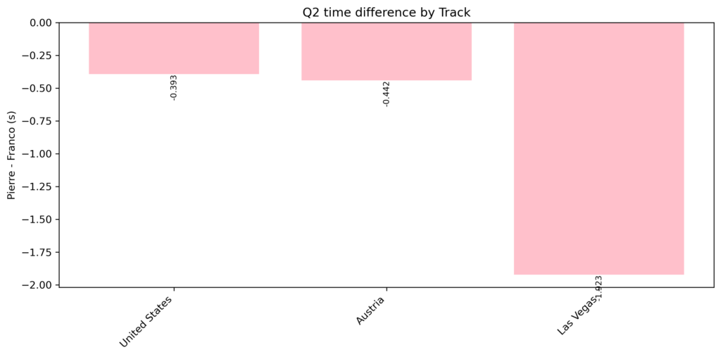 Having a slow car is nothing new, however Gasly extracted more out of the A525, as seen in the race qualifying data. In shared races, Colapinto had 5 Q2 appearances compared to Gasly’s 10. Furthermore, in Q3, Colapionto did not see Q3 in a main race qualifying this season, with Gasly in 7 Q3 appearances.